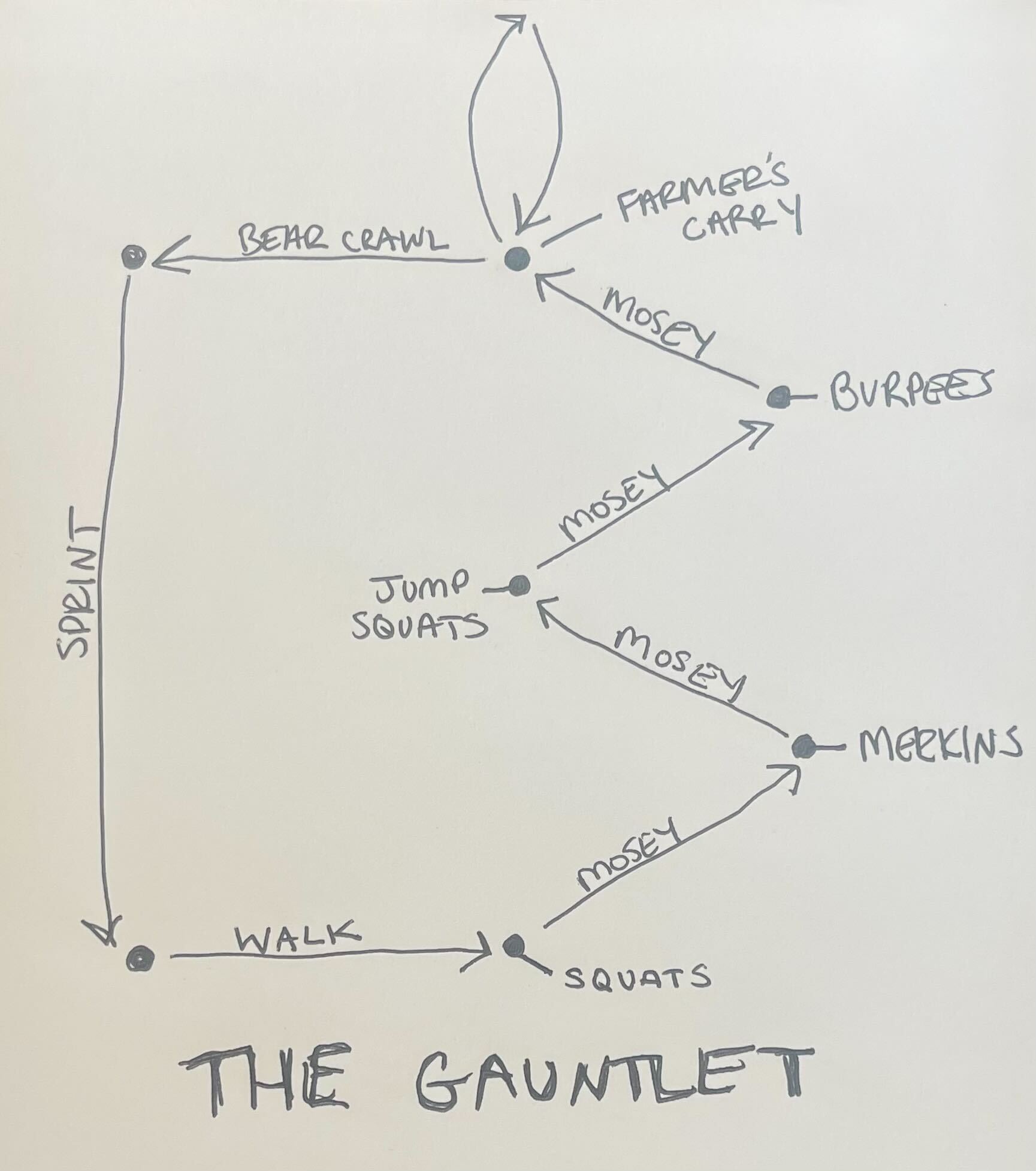 Twenty merkins at base of stairs then bear crawl to top of steps across street.
